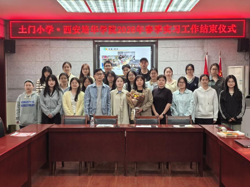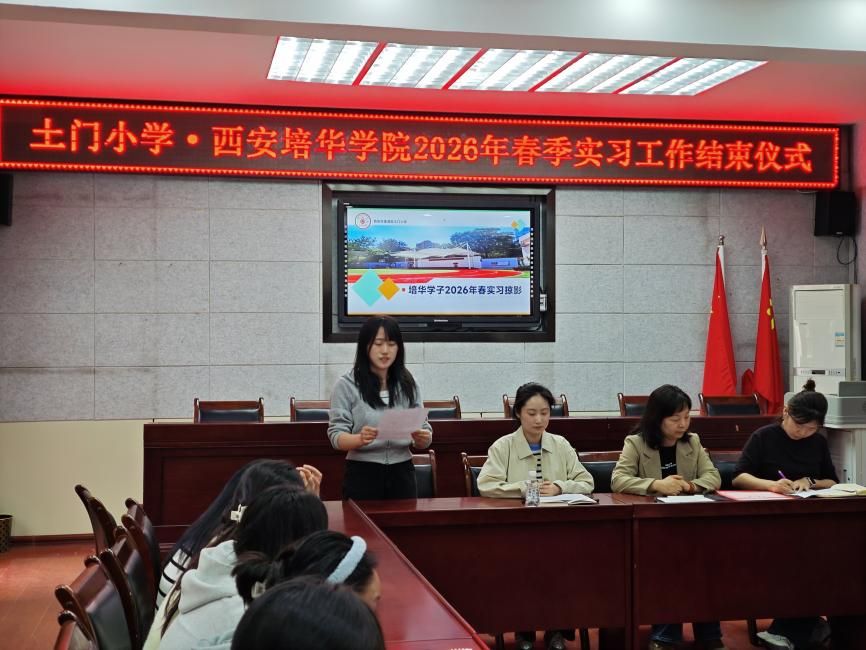 为全面总结毕业实习工作,表彰优秀实习生,进一步巩固校际合作成果,西安培华学院文学院于2026年4月10日赴西安市莲湖区土门小学,参加了2022级毕业实习总结表彰会。本次活动由土门小学教导处主任侯瑛主持,土门小学相关领导、文学院教师代表及全体实习生共同参加。