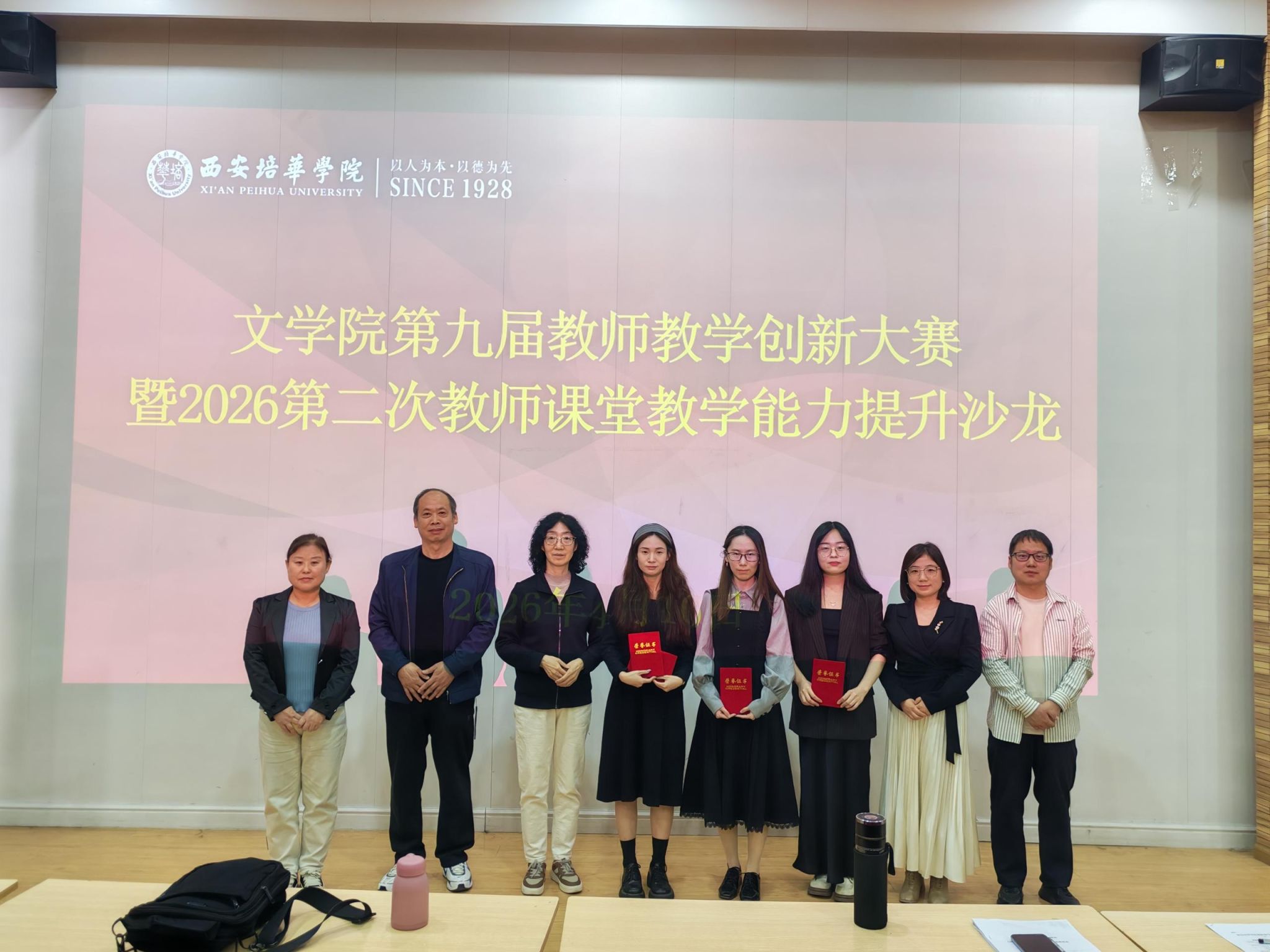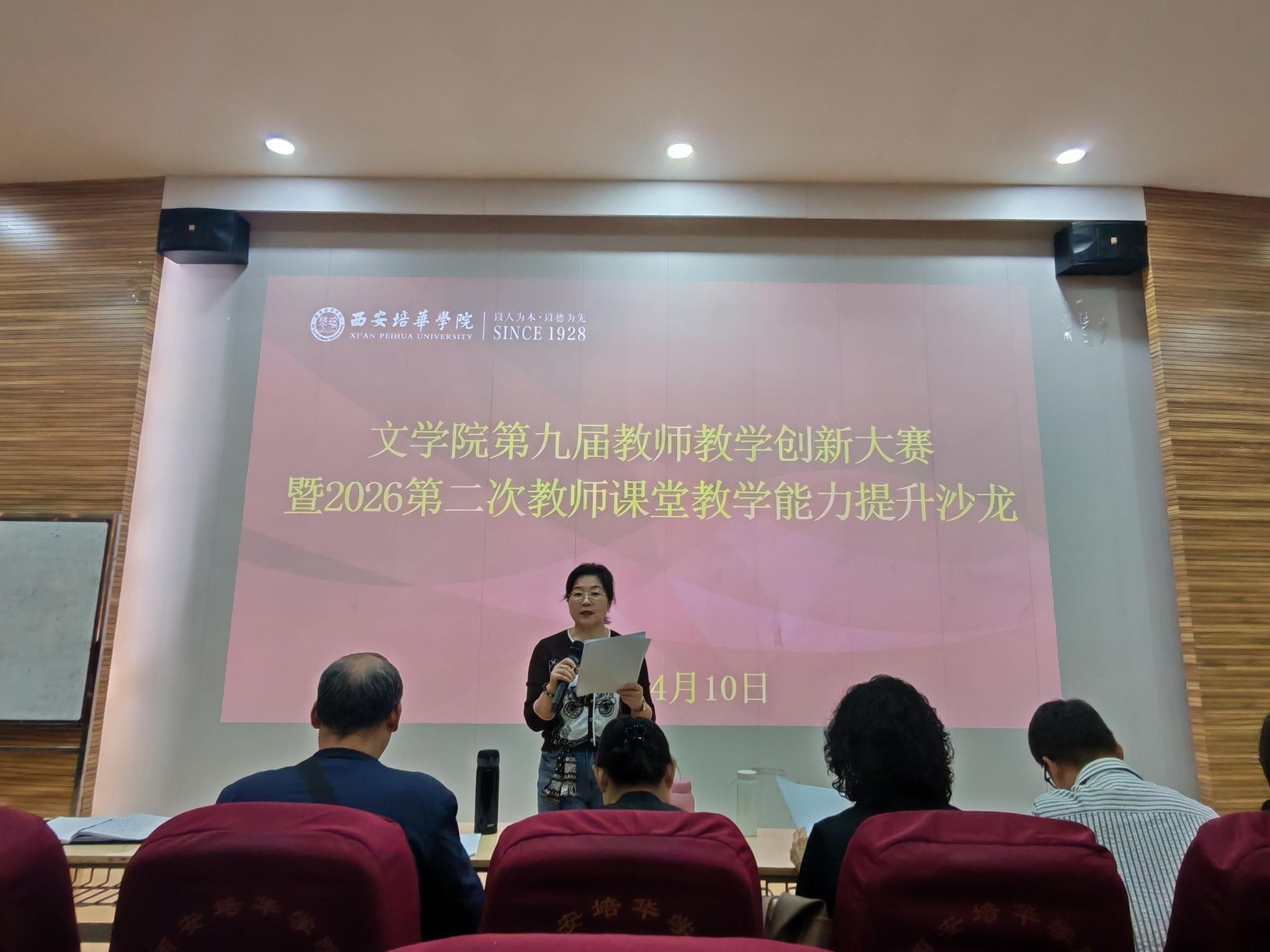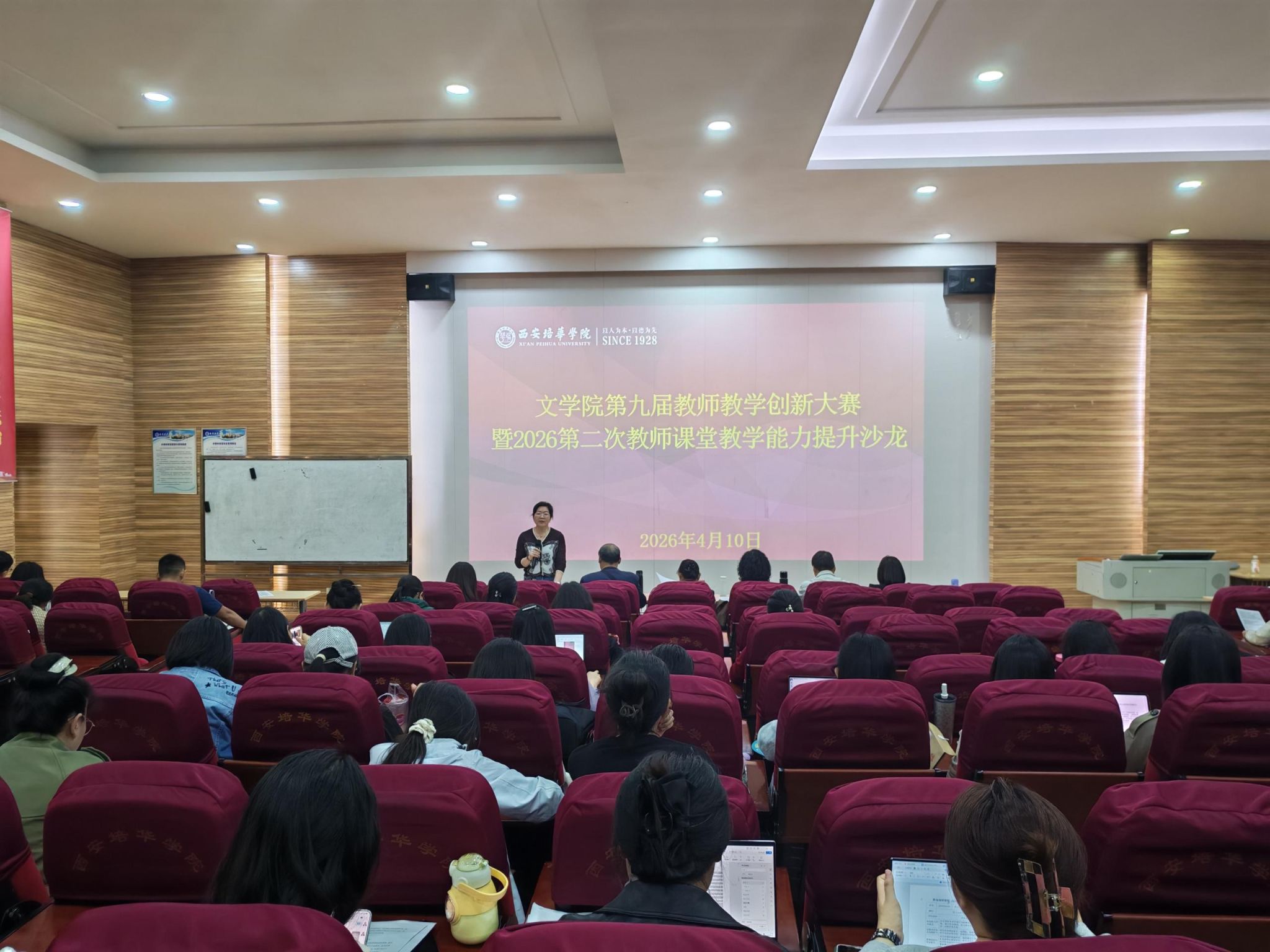 为深入贯彻落实立德树人根本任务,全面推进教育教学改革创新,持续提升教师教学能力与竞赛能力,2026年4月10日14:00,西安培华学院文学院在格物楼J101教室成功举办第九届教师教学创新大赛暨2026年度第二次教师教学能力提升教学沙龙。本次活动由文学院教学、科研、产学研副院长乔芳主持,4位教师代表参与创新教学展示,5位评委悉心指导,全院专任教师共同参与观摩研讨,活动氛围浓厚、成效显著。