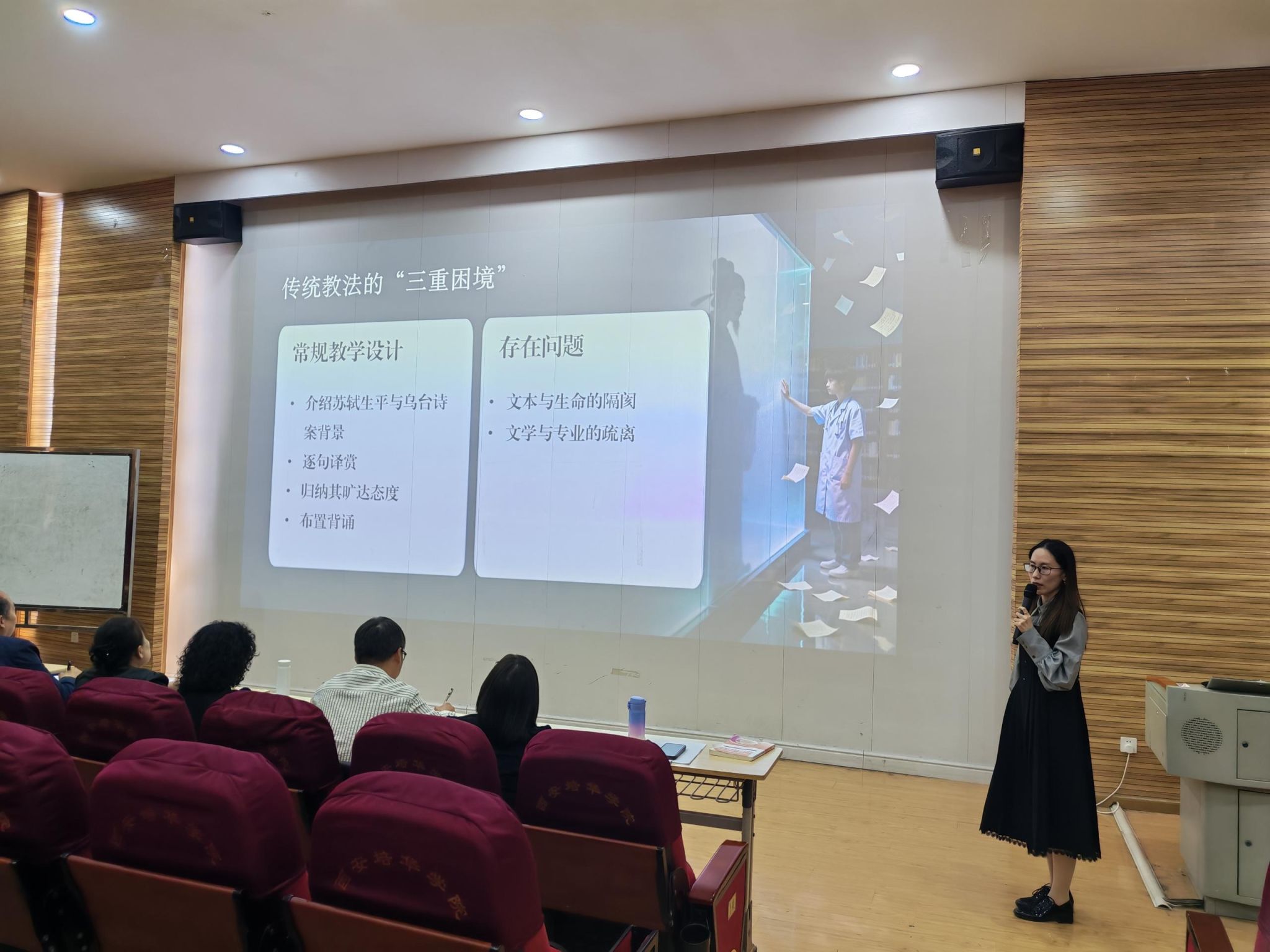 竞赛展示环节中,高晨蕊、张媛、常熠炜、于笑颜4位教师紧扣课程特点与教学创新主题,精心设计教学流程,充分展现了文学院教师扎实的教学功底、鲜明的教学风格与突出的创新能力。高晨蕊老师深耕现代汉语教学,将语言规范应用与日常表达紧密结合,打破传统语言课的枯燥模式,注重学生语言运用能力的实践,让语言学习更具实用性与趣味性;张媛老师以现当代文学作品为载体,立足文本细读,巧妙融入时代精神与人文情怀,深度挖掘课程思政育人元素,实现知识传授、能力培养与价值引领的统一;常熠炜老师聚焦文学创作与批评实践,打通理论教学与创作实操壁垒,采用案例分析、现场创作等多元教学方法,引导学生在读写结合中提升文学素养,探索个性化、互动式教学新路径。于笑颜老师以MBTI人格心理学为跨学科解读工具、借AI数字人苏轼全程沉浸式“陪读”、将古典生命哲学转化为医学生职业意义感的“文医融合”型教学创新课。