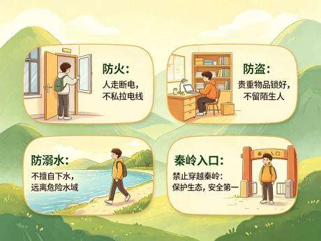 放假前夕,全体师生需紧绷安全之弦。各班级、各部门都会开展安全宣传教育,重点普及防火、防盗、防溺水、交通安全和应急避险知识,违规穿越秦岭这类危险行为坚决不碰!