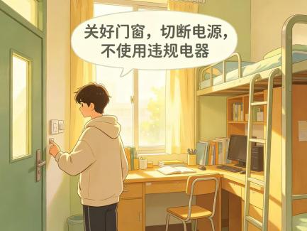宿舍安全:大功率电器、私拉乱接电线、使用明火这些危险行为统统禁止,消防安全无小事!离校/离寝:离开宿舍、办公场所时,记得断电、关窗、锁门,贵重物品要收好,防盗防患不马虎。
