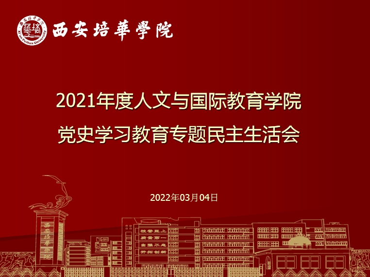 3月4日下午,学院领导班子党史学习教育专题民主生活会在格物楼第四会议室召开。会议以大力弘扬伟大建党精神,坚持和发展党的百年奋斗历史经验,坚定历史自信,践行时代使命,厚植为民情怀,勇于担当作为,团结带领人民群众走好新的赶考之路为主题。西安培华学院副校长兼人文与国际教育学院院长刘越莲、学院领导班子、院党委委员、系主任、民主党派代表参加会议。会议由院党委书记王飞主持。