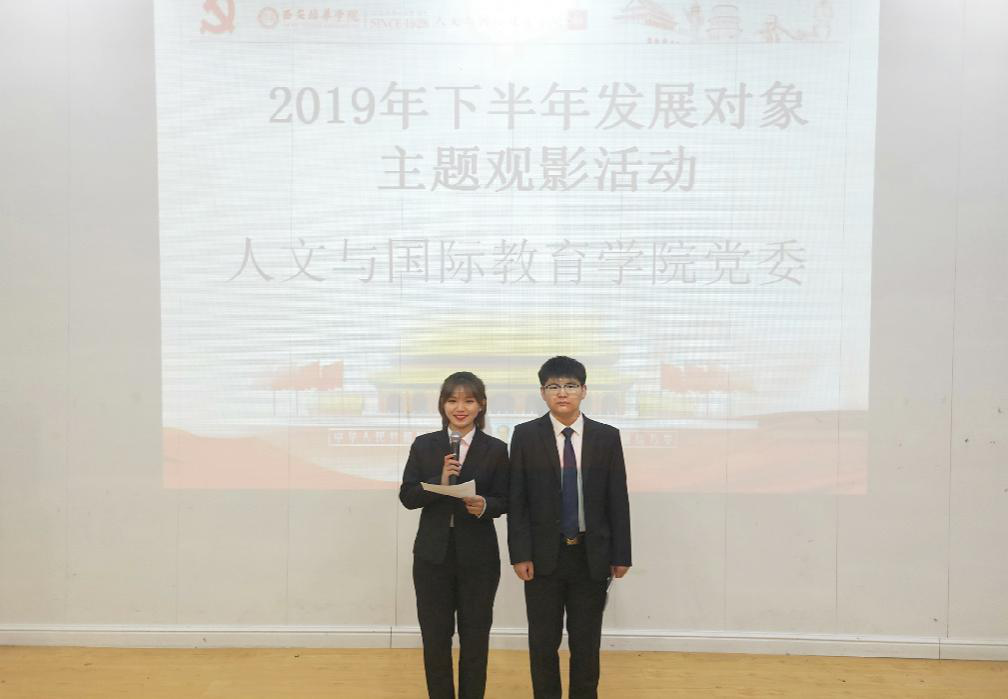 为扎实做好发展党员工作,确保发展党员质量,按照校党委工作部署安排,人文与国际教育学院党委于2019年11月7日晚19点组织2019年下半年发展对象在格物楼J101教室集中观看电影《周恩来的四个昼夜》。活动由刘希瑶、刘鑫主持,我院七个学生党支部共计124人参加此次观影活动。