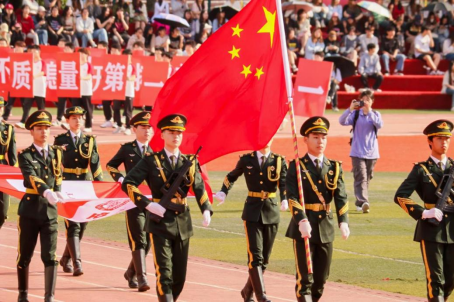 在激昂的音乐声中,国旗方队、校旗方队等特色方队依次入场