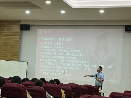 讲座的后半部分,鲁博老师针对于研究生院校的选择,专业的选择,进行了非常详尽的讲解,为学生讲解了英语专业考研院校的规划,院校的要求,以及如何根据自身情况去选择最合适自己的院校和专业,如何更有针对性地去备考,去学习,有效地提高学习的效率。