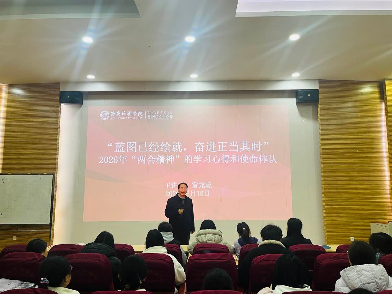3月18日中午马克思主义学院雷龙乾教授在格物楼J101教室为我院师生党员讲授“蓝图已经绘就,奋进正当其时”——2026年“两会精神”的学习心得和使命体认主题党课。本次党课雷龙乾教授为我院师生党员深入解读全国两会精神特别是习近平总书记重要讲话精神,党员们专注听讲并认真记录。