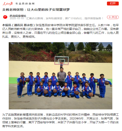 人民日报报道学校青年教师张恒在马岔中心小学支教献爱心