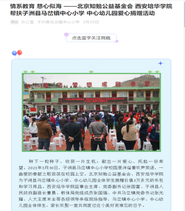 西安培华学院作为一所即将迈向百年的民办高校,不忘办学初心,牢记育人使命,将社会服务作为学校发展建设的重要内容,在我省“两联一包”扶贫工作中,学校对口帮扶榆林市子洲县,在做好驻村联户、产业脱贫等工作的同时,学校将送教支教作为教育扶贫的一项重要举措,为当地摆脱贫困贡献着一份力量。