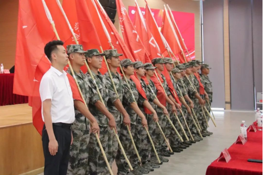 在军训团授旗仪式上,学校党委副书记、副校长姚文静和与会领导分别为军训团授团、营、连旗。在雄厚的中国人民解放军军歌声中,军训团团旗庄严入场,护旗手步伐整齐,铿锵有力。以青春之名,护旗荣光。