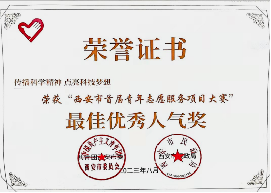 大会揭晓了西安市首届青年志愿服务项目大赛评选结果,我校青年志愿者联合会申报的《以青春之名“培”你健康成长》、红十字会学生分会申报的《聚爱三秦 “救”在身边》和智能科学与信息工程学院团委申报的《传播科学精神 点亮科技梦想》分别斩获银奖、铜奖和最佳优秀人气奖。