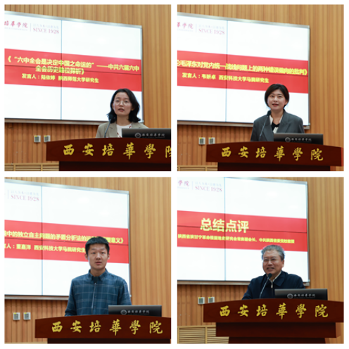 陕西师范大学研究生代表陆依婷作了《“六中全会是决定中国之命运的”——中共六届六中全会历史地位探析》的发言,西安科技大学研究生韦妍卓作了《论毛泽东对党内统一战线问题上的两种错误偏向的批判》的发言,西安科技大学研究生董嘉洋作了《统一战线中的独立自主问题的矛盾分析法的运用与重要意义》的发言,陕西省陕甘宁革命根据地史研究会常务副会长、省委党校毕远佞教授作总结点评。