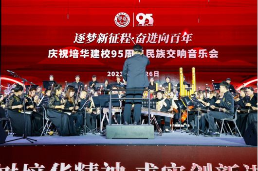 在本场音乐会中,乐团以人声与乐队、器乐与乐队为编制,精心选取经典曲目为培华师生倾心演奏。《庆典序曲》作为开场曲目以慷慨澎湃之势先声夺人,开启本次音乐之旅;《五彩的窑洞》用温婉悠扬的旋律展示了陕北乡亲的烟火气画面;《关雎》曲调优美婉转,清新华丽,歌颂了纯真爱情以及人们对美好事物的追求和向上的精神;铿锵有力的《弓舞》将独具特色的民族风情展现得淋漓尽致;《永远的山丹丹》用史诗般的音乐语言讲述在那片黄土地上发生的故事;一曲激情澎湃的《我的祖国》深切地表达了浓烈的爱国主义思想; 观众们耳熟能详的《好汉歌》曲调或恢弘大气或激情澎湃,点燃了大家的音乐热情。