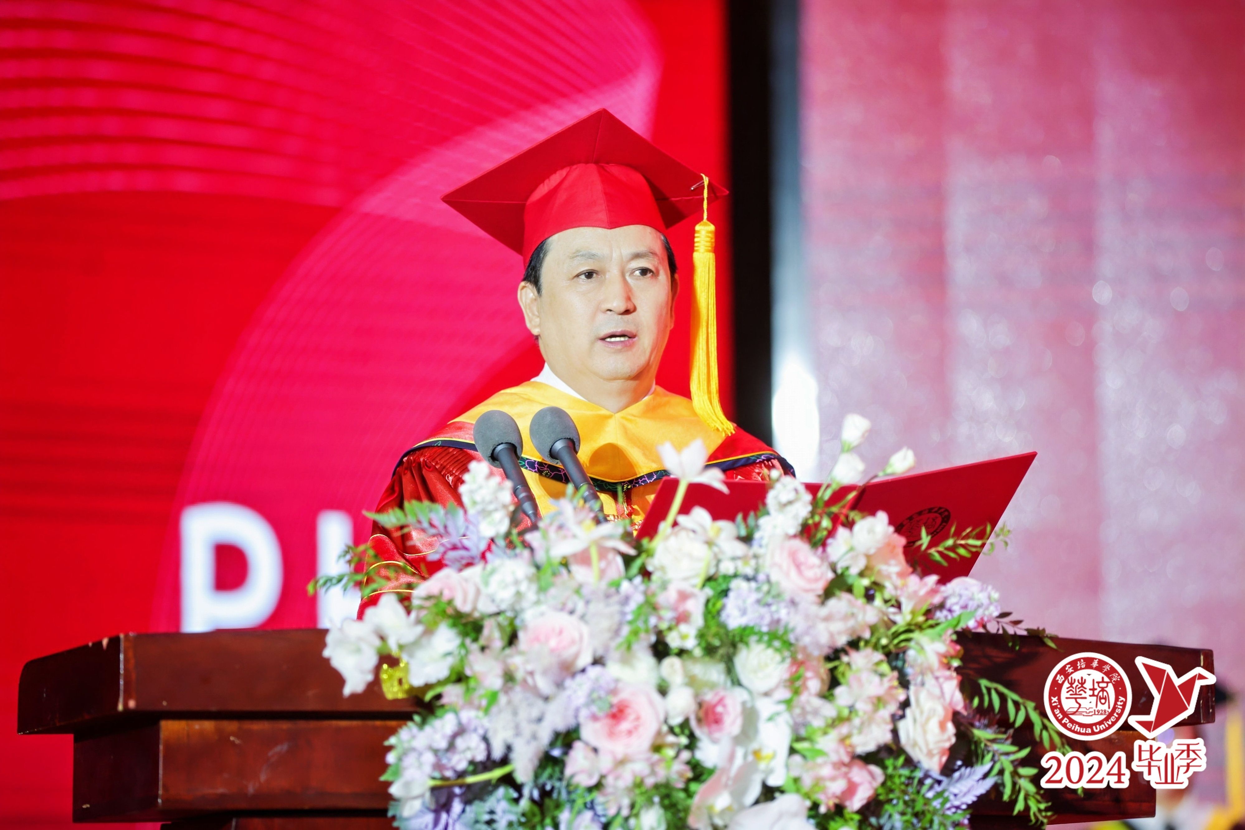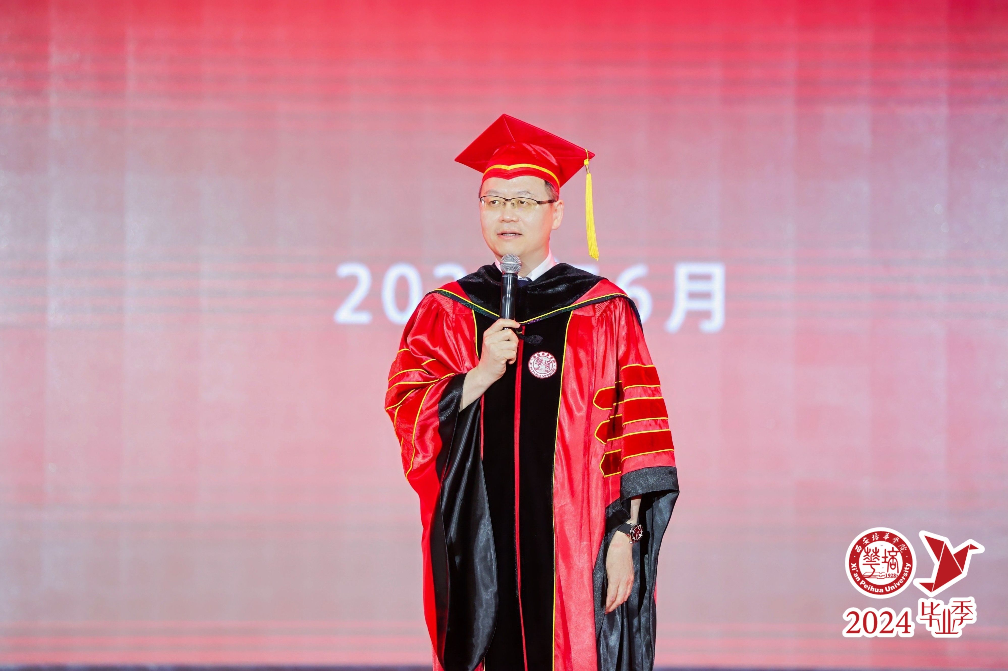 作为培华的大家长,姜波理事长语重心长地向毕业生告别。他回顾了学校自建校以来所经历的风雨历程,他表示在每个重要的历史节点上,培华人都拒绝“躺平”,做出了众多令人瞩目的成绩。他寄语全体毕业生们,要传承培华精神,卧薪尝胆,不畏艰难,用实际行动书写新的人生篇章;面对AI时代的到来,他叮嘱毕业生们要积极拥抱新技术,成为具备跨学科知识、技能的复合型人才;他还说到培华永远是校友们的避风港,无论未来走向何方,学校都会为每一位培华人的发展持续赋能、终身服务。
