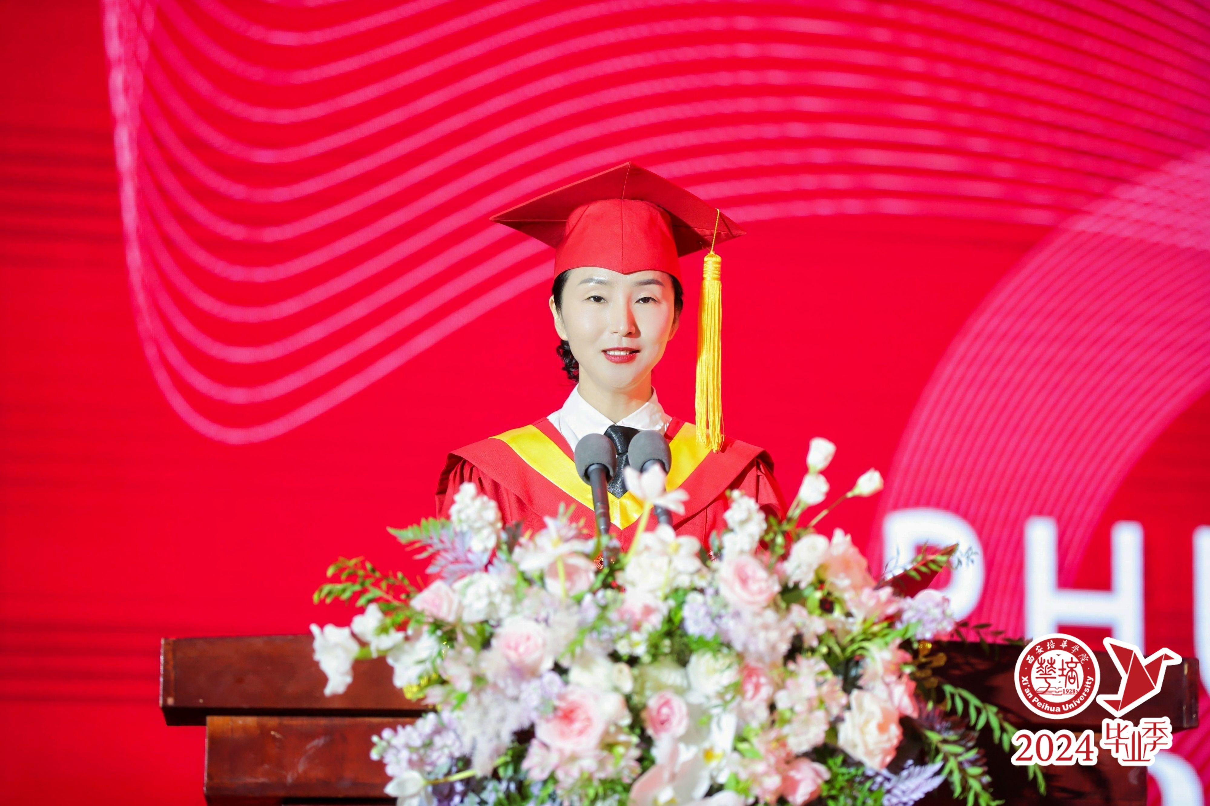 人文与国际教育学院员泽阳同学作为毕业生代表发言。他向学校、老师、家人的无私守护以及理事长的栽培表达了感谢,深情地回顾了在培华锤炼意志的青春岁月。他讲到,在培华的学习与历练,是孕育无限希望的青春加油站。细数大学的1460多个日日夜夜,一直在师友的帮助下脚踏实地的学习成长。他动情地说:毕业离校后将带着历久弥新的培华精神和不断突破的挺膺担当一路向前!