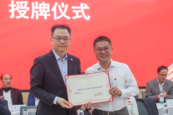 随后,大会迎来了激动人心的时刻。全国民办高校体育联盟理事长姜波宣布“四川省民办高校体育联盟”正式成立。姜波理事长向四川国际标榜职业学院授予了“全国民办高校体育联盟副理事长单位”和“四川民办高校体育联盟主席单位”的荣誉称号。