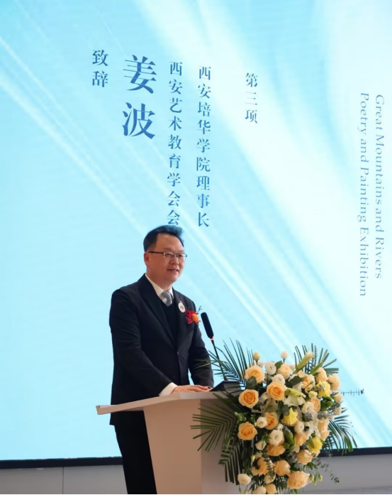 西安培华学院理事长、西安艺术教育学会会长姜波作为诗画展指导单位致辞