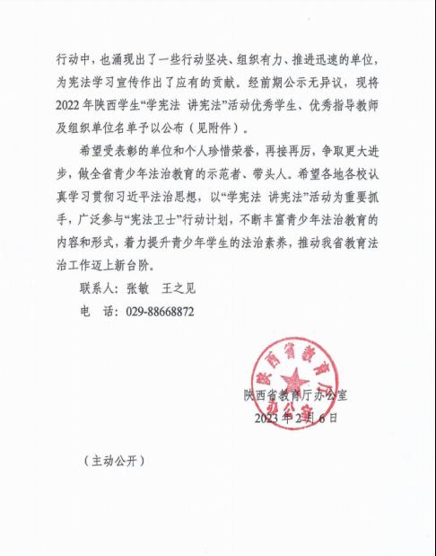 按照教育部安排,省教育厅于2022年组织开展了全省学生“学宪法 讲宪法”活动,包括演讲比赛、知识竞赛、“宪法卫士”行动等内容。近日,陕西省教育厅通报表彰2022年度“学宪法 讲宪法”活动优秀学生、优秀指导教师和优秀组织单位。我校因“学宪法 讲宪法”工作成绩突出,荣获2022年度优秀组织单位。