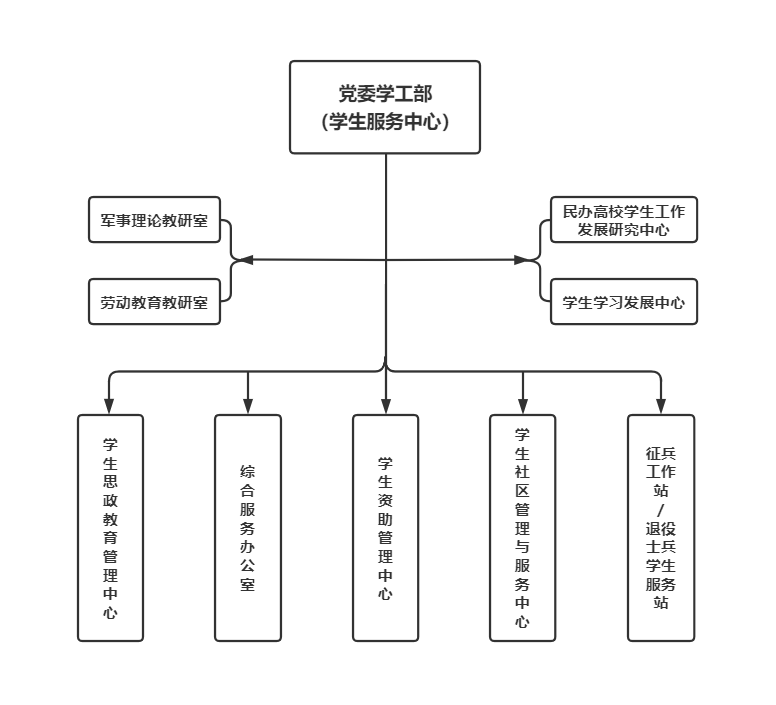 党委学工部(学生服务中心)现设综合办公室、学生资助中心、社区管理与服务中心、征兵工作站以及思政教育管理中心,成立了劳动教育教研室和军事理论教研室,同时指导民办高校学生工作发展研究中心和学生学习发展中心工作。锻造了一支“素质高、能力强、业务精、作风硬、格局大”的学工管理团队。