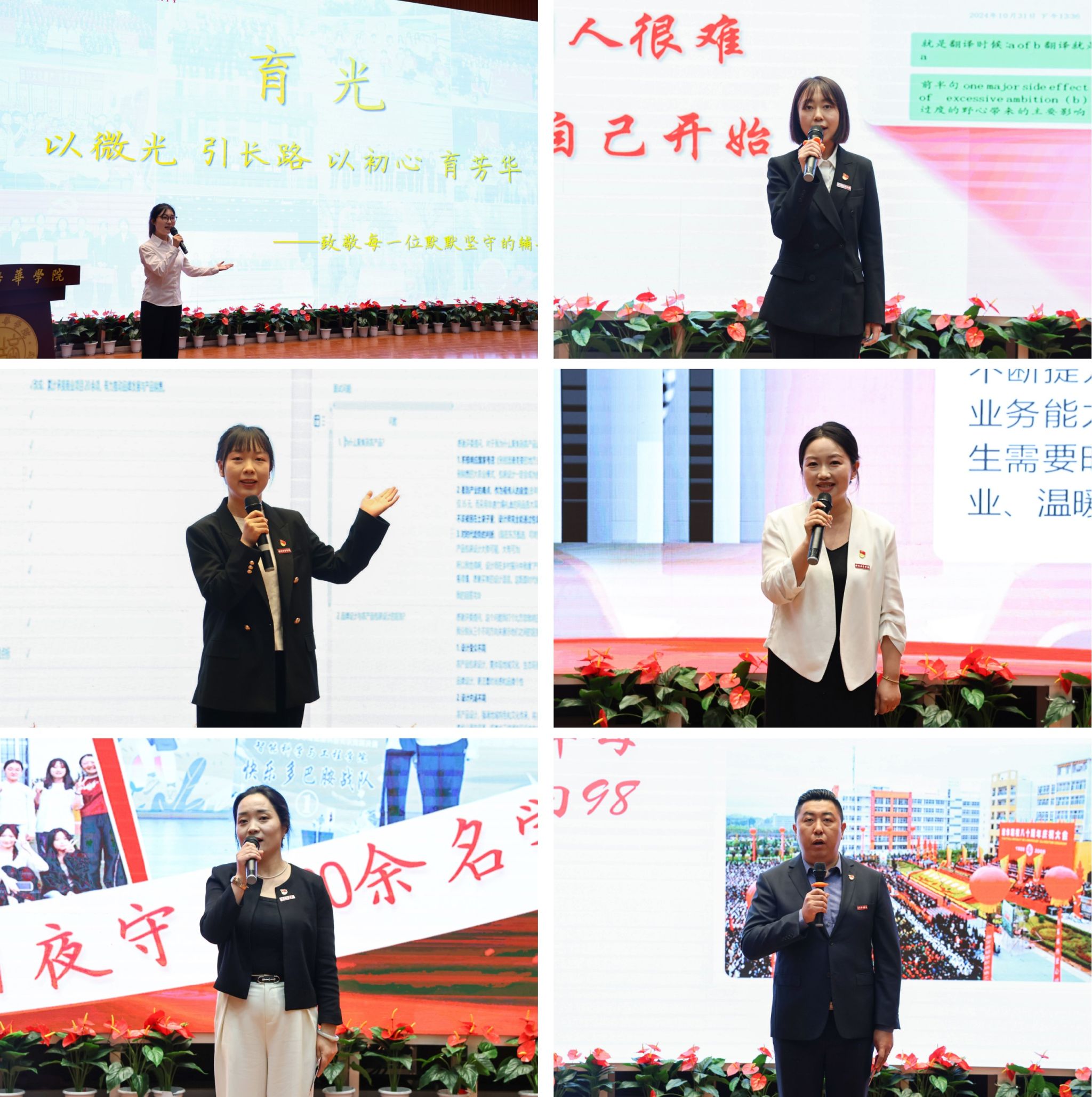 辅导员秦佳宁以“启光”为核心,生动讲述了她用真诚与坚持,陪伴一名英语严重偏科学生重拾学习信心、最终顺利通过考试的暖心故事。她以真心换真心,用耐心与陪伴点亮学生成长之路,引发与会人员强烈共鸣,获得一致好评。辅导员郝甜甜以“承光”为主题,分享了她与学生小徐携手备战职业规划大赛的成长历程。从院赛突围到省赛角逐,她以师者初心引路护航,学生以青春姿态奋力前行,师生同心同向、彼此成就。真挚而饱满的讲述打动全场,赢得阵阵掌声。辅导员寇方译以“传光”为题,分享了一名女生从怯场迷茫到蜕变为“发光者”的成长故事,让她深刻读懂了辅导员作为高校“第四支队伍”,开展大学生思想政治教育工作的社会责任感、光荣感和使命感。辅导员范静毅以“守光”为题,讲述了她用八年时光守护和助力700余名学子“成人、成才、成功”的感人故事,特别是用爱心、热心陪伴残疾且患有严重癫痫的吴同学跨越成长难关,最终该生获评“全国大学生自强之星”,并扎根基层残联工作。辅导员王迪以“聚光”为题,生动讲述了在辅导员岗位工作十八载,陪伴学生从迷茫走向入党并成长为基层公务员的点点滴滴。“如果再给我一次机会,我依然会选择做那个高举火把的引路人”道出了他的育人初心。