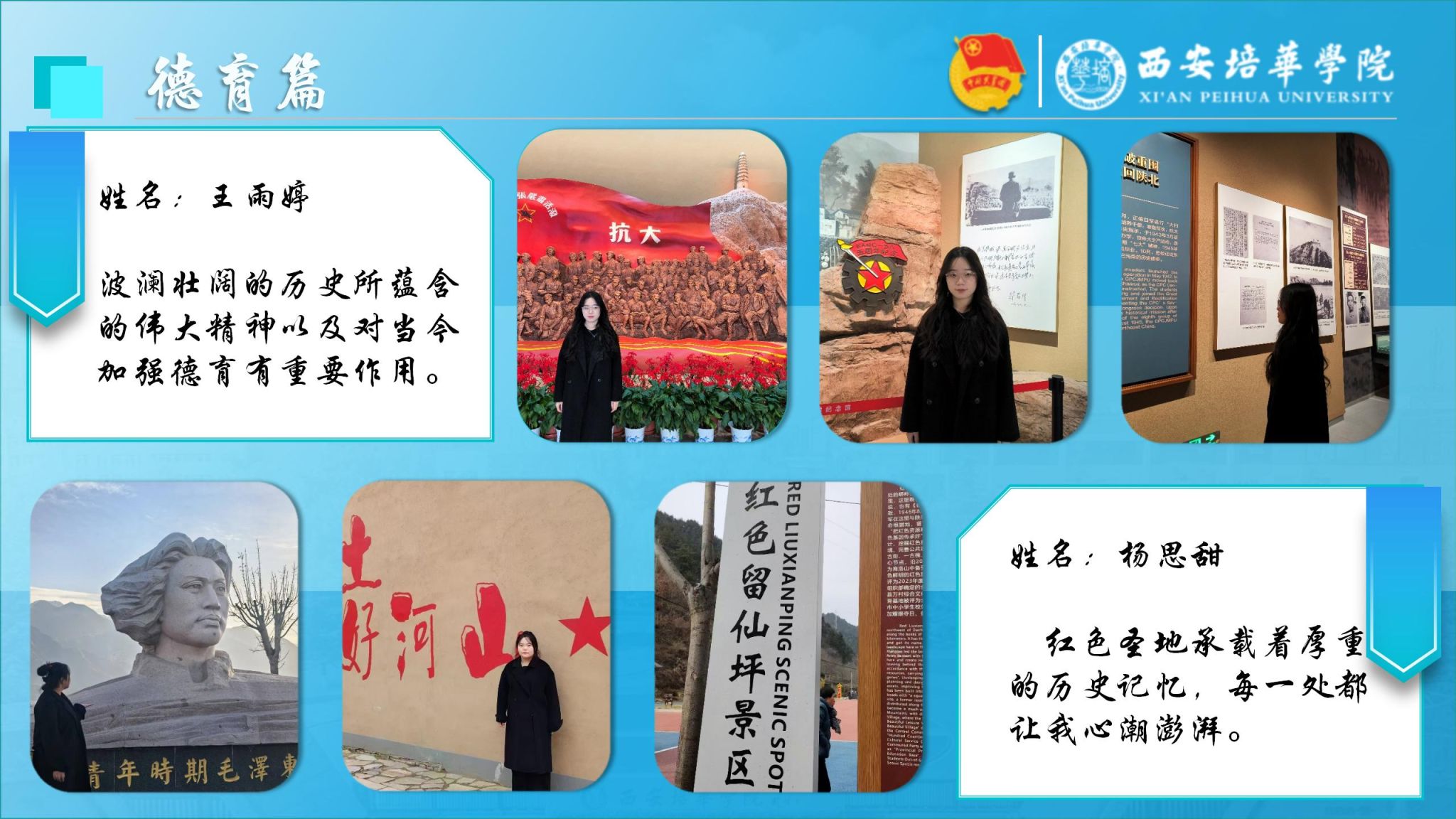 通过组织研读红色书籍、走访红色教育基地等活动,引导学生深入学习党的创新理论、“四史”及校史,筑牢理想信念;鼓励学生参与社区志愿服务、公益帮扶等实践,践行社会主义核心价值观,将价值追求转化为行动自觉;以学习笔记、红色宣讲短视频、校史故事分享会等多元形式丰富成果表达,推动理论学习与德育教育深度融合,培育学生优良品格。