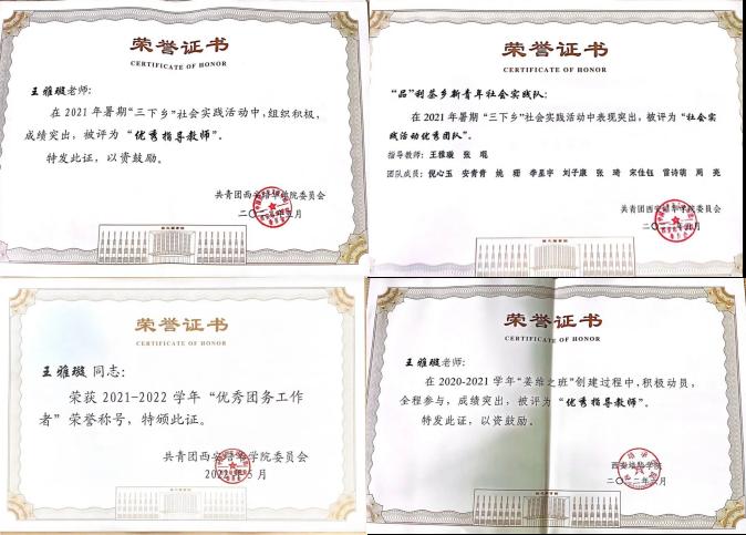 王雅璇,中共党员,讲师,硕士研究生,2015年9月担任辅导员,现担任传媒学院辅导员兼团委书记。考取资格证书心理咨询师、国际创业中级教练,北森生涯规划师、北森职业指导师等资格证书。所带班级新闻学1902连续两年获得姜维之班创建提名班,连续三年获得先进班集体、优秀团支部,2021该支部被评选为“陕西省五四红旗团支部”。指导学生参赛获奖,2019级新闻学专业周亮获得2021年全国百佳心理委员,2022年新闻学1902倪心玉等入选陕西省大学生自强之星标兵,并入选全国自强之星。担任团委书记期间传媒学院获得五四红旗团委及2021年三下乡社会实践优秀组织单位;个人多次获得优秀辅导员、优秀团务工作者、就业先进个人、姜维之班创建优秀指导老师、抗疫先进个人,所带班级2022年获得全国五四红旗团支部,2022年获得陕西省社会实践三下乡先进个人。