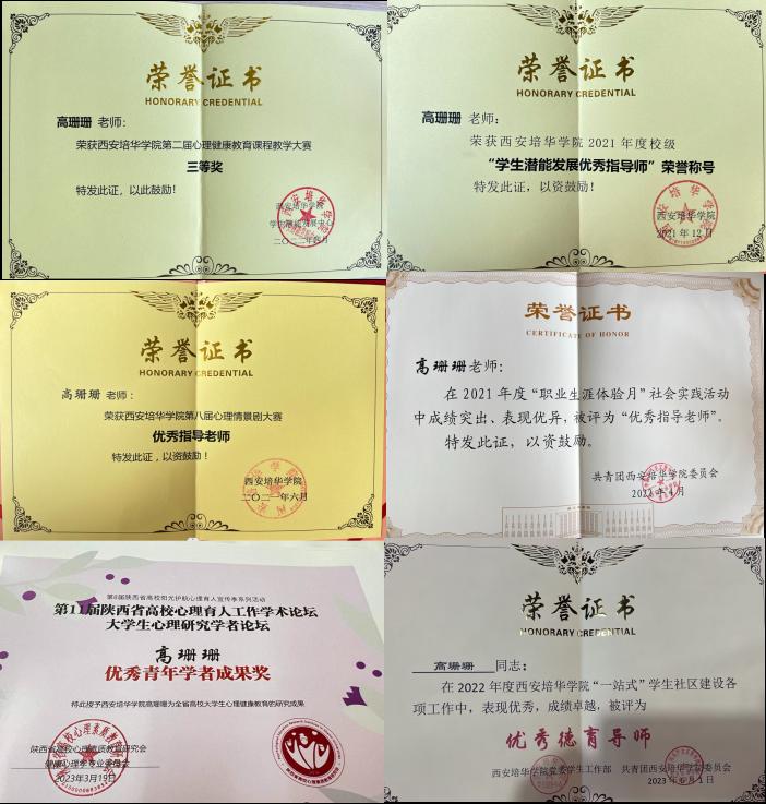 高珊珊,女,汉族,中共党员,西北大学法学硕士研究生,现担任智能科学与信息工程学院学生干事,负责学院日常思政教育,学生活动组织、公寓文化建设及学生潜能发展辅导站建设,资助育人与招生就业等工作。在岗期间先后荣获校级学生潜能发展优秀指导老师,陕西省百嘉心理辅导师;《做情绪的主人》获省培百家心理慕课一等奖;第11届陕西省高校心理育人优秀青年学者成果奖,社区优秀德育教师,陕西省高校育德育心先进个人,陕西省高校第六届慕课微课《做情绪的主人》铜奖,校级第二届心理健康教育课程教育大赛三等奖;校级抗击疫情先进个人;并指导学生“互联网+”创新创业项目2项;在《现代商贸工业》发表《大学生遭受电信网络诈骗现象分析及对策研究》论文1篇;参与思政类相关工作精品项目省级课题1项:《“五心同筑、双元互动、五育并举”—高校525心理育人工程的实践与创新》;参与思政类相关工作校级研究课题1项;主持校级课题1项。