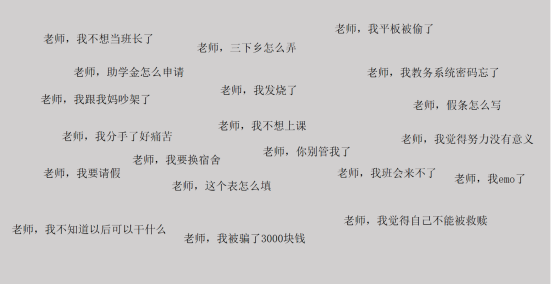 这一张图里,是过去两年中我听到的部分学生的反馈,相信辅导员们一定会有共鸣。从高数挂科到失恋难过,从不知道假条怎么写到调研报告怎么做,当千奇百怪的问题乘以200的带班人数时,要如何去处理呢?