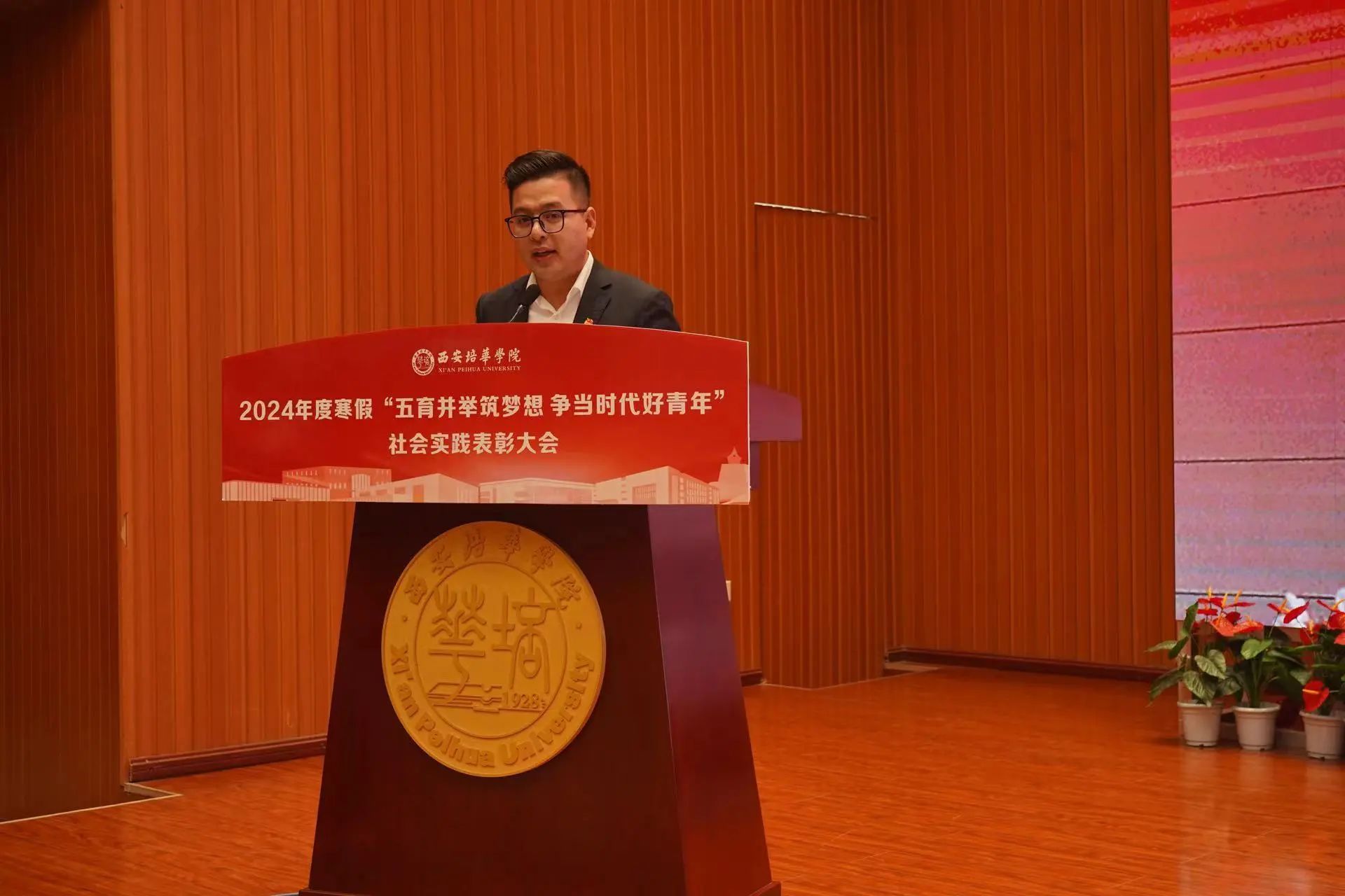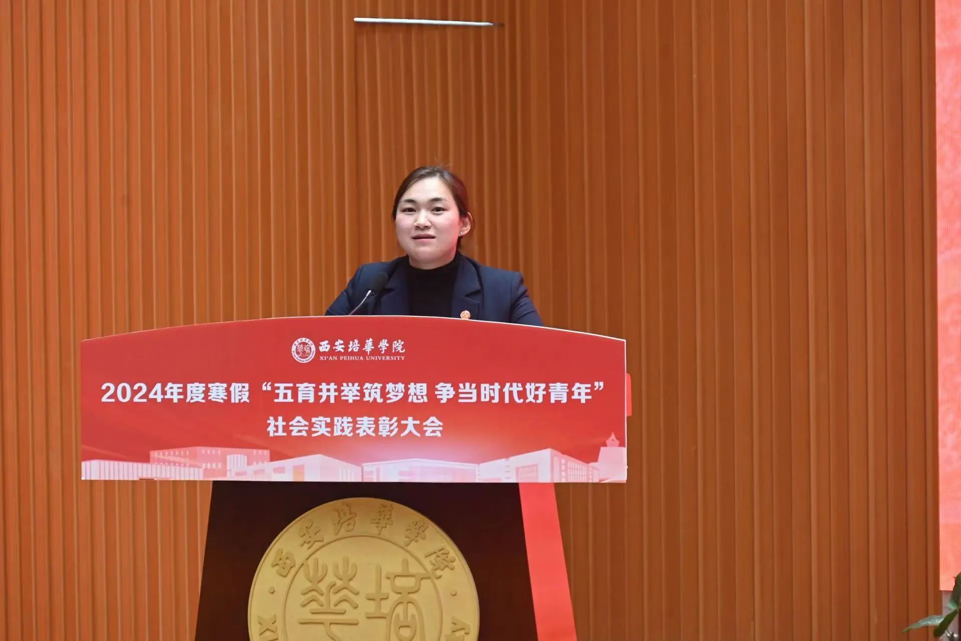 ▲校团委书记董莹宣读《西安培华学院关于表彰2024年寒假返家乡“五育并举”系列实践活动“先进个人”、“优秀指导教师”、“先进集体”的通报》