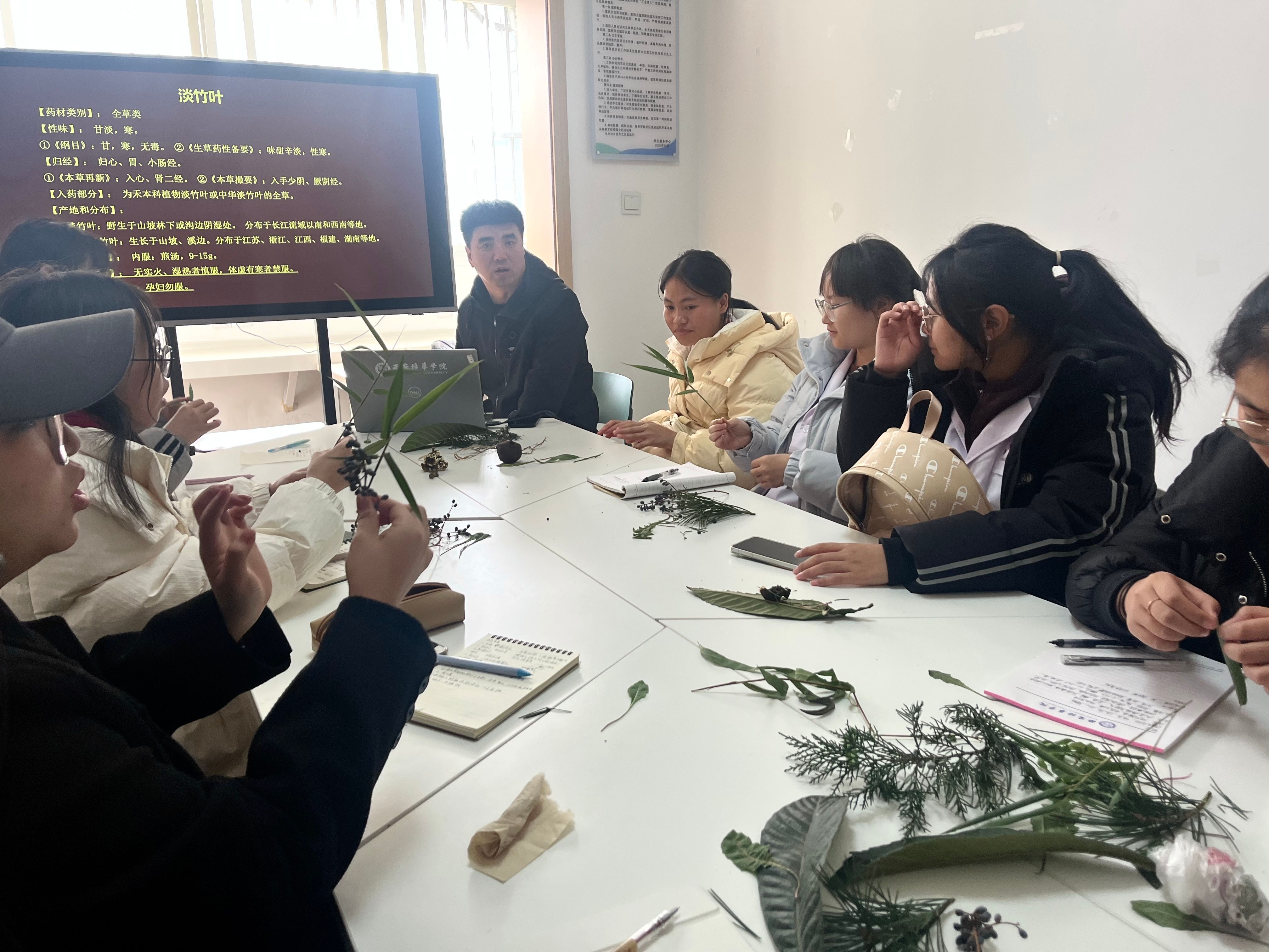 张老师采集了八种校园里的植物(松针、批把叶、侧柏叶、蒲公英、淡竹叶、石榴、女贞子、狗尾草),对八种植物的性味归经、主治、以及注意禁忌展开分析讲解。同学们兴趣浓厚,仔细观察每一种中草药的形态,并结合病案进行讨论用药。