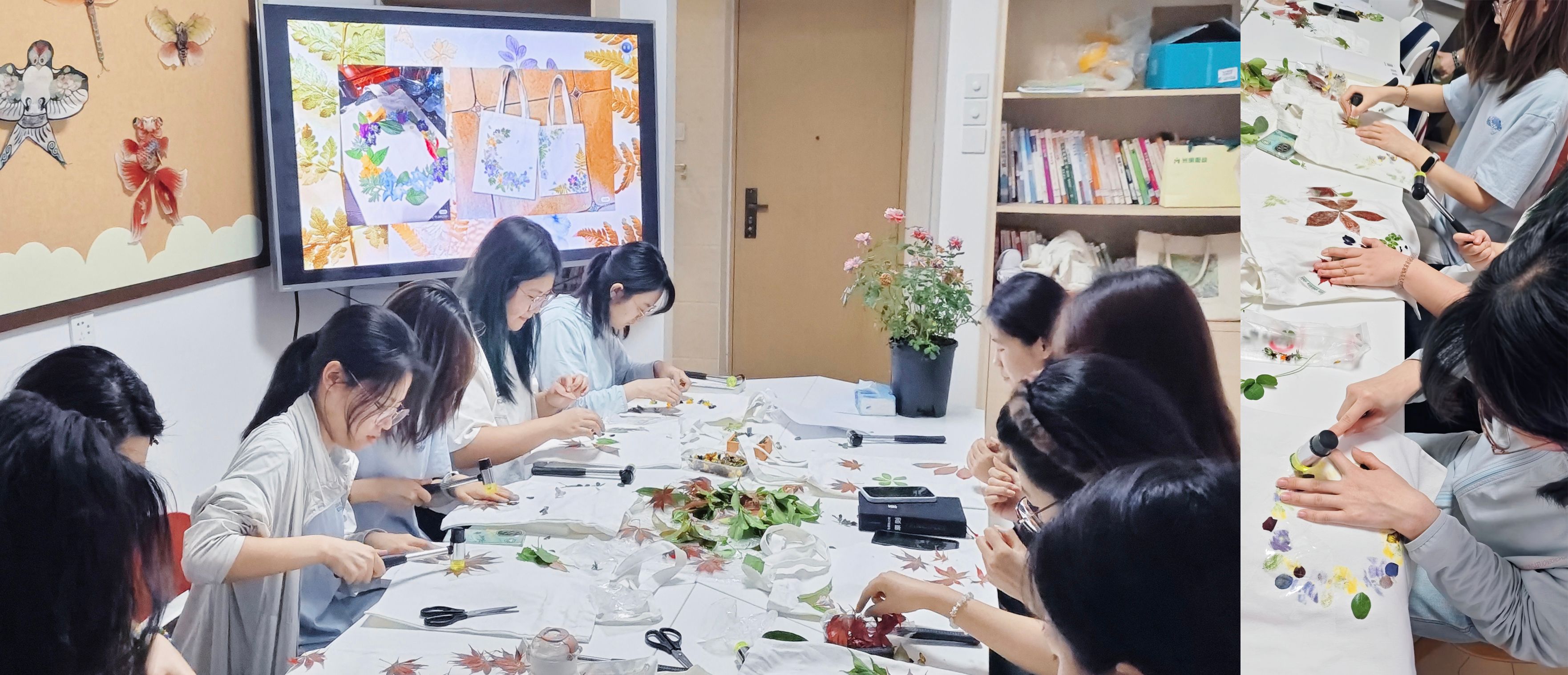 同学们对拓染文化有一定了解后开始动手实践,将新鲜的花叶摆放、捶打拓印于棉布包上,形成天然纹样。通过体验拓印过程,提高学生的动手实践能力,感受拓染文化的独特魅力,激发学生对传统文化的热爱。