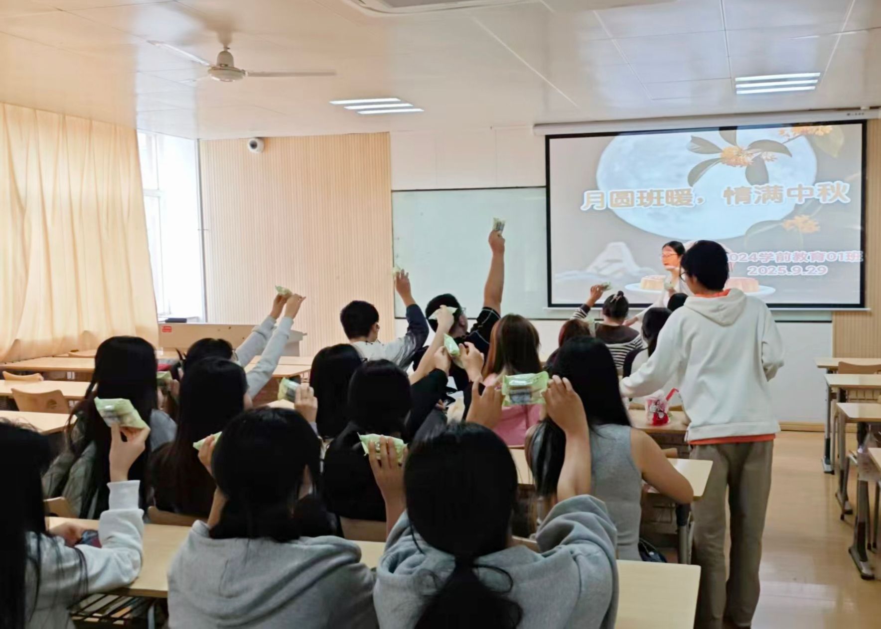 △副校长、党委副书记姚文静为同学们发放月饼