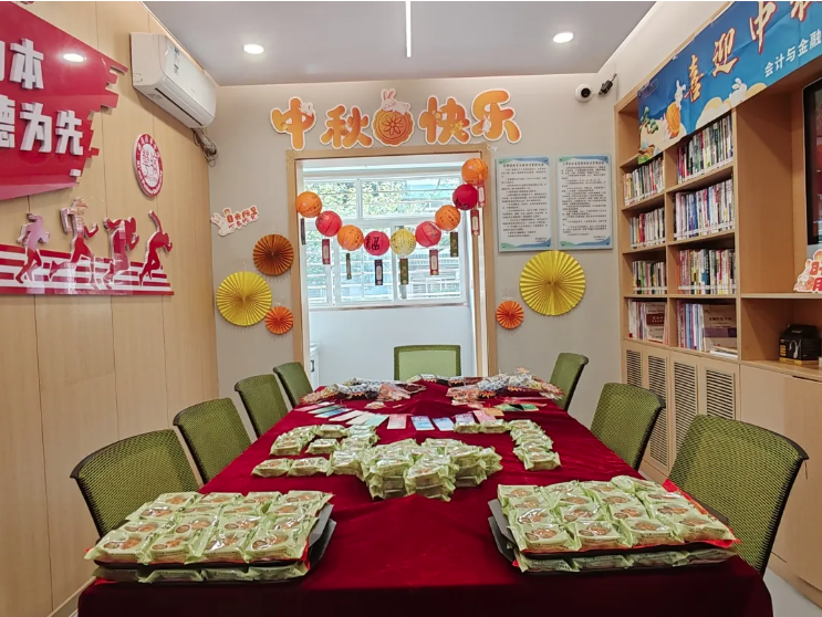 △财务总监、财务与资产管理中心主任薛清为同学们发放月饼