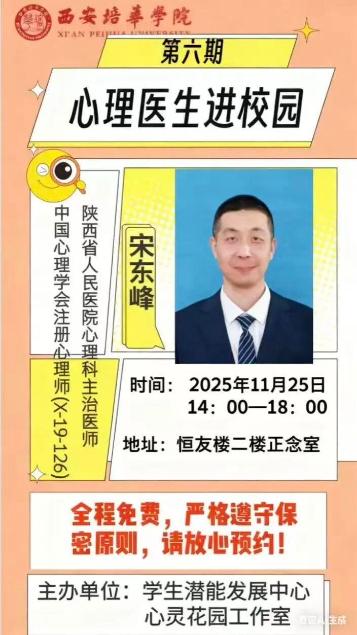 本次活动延续往期优质资源,再次邀请中国心理学会注册心理师、陕西省人民医院心理科主治医师宋东峰医生到校,以线下一对一问诊的形式为学生提供服务。活动前期,学生潜能发展中心通过各二级学院提前摸排需求、预约登记,确保服务精准覆盖有需要的学生群体。