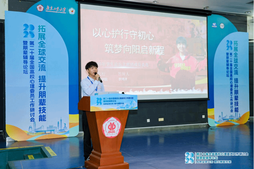本次论坛以“创新朋辈辅导路径,筑牢心理健康防线”为主题,秘书处成员均从“全国百名心理委员风采展”入选者中择优产生。作为我校心理委员骨干,罗鸿洋在论坛中围绕“校园团辅提质、心理活动创新、校外实践延伸”三大维度,分享了我校朋辈心理工作的特色实践,凭借清晰的思路与亮眼的成果获得全国高校代表的一致认可,成功入选秘书处队伍。
