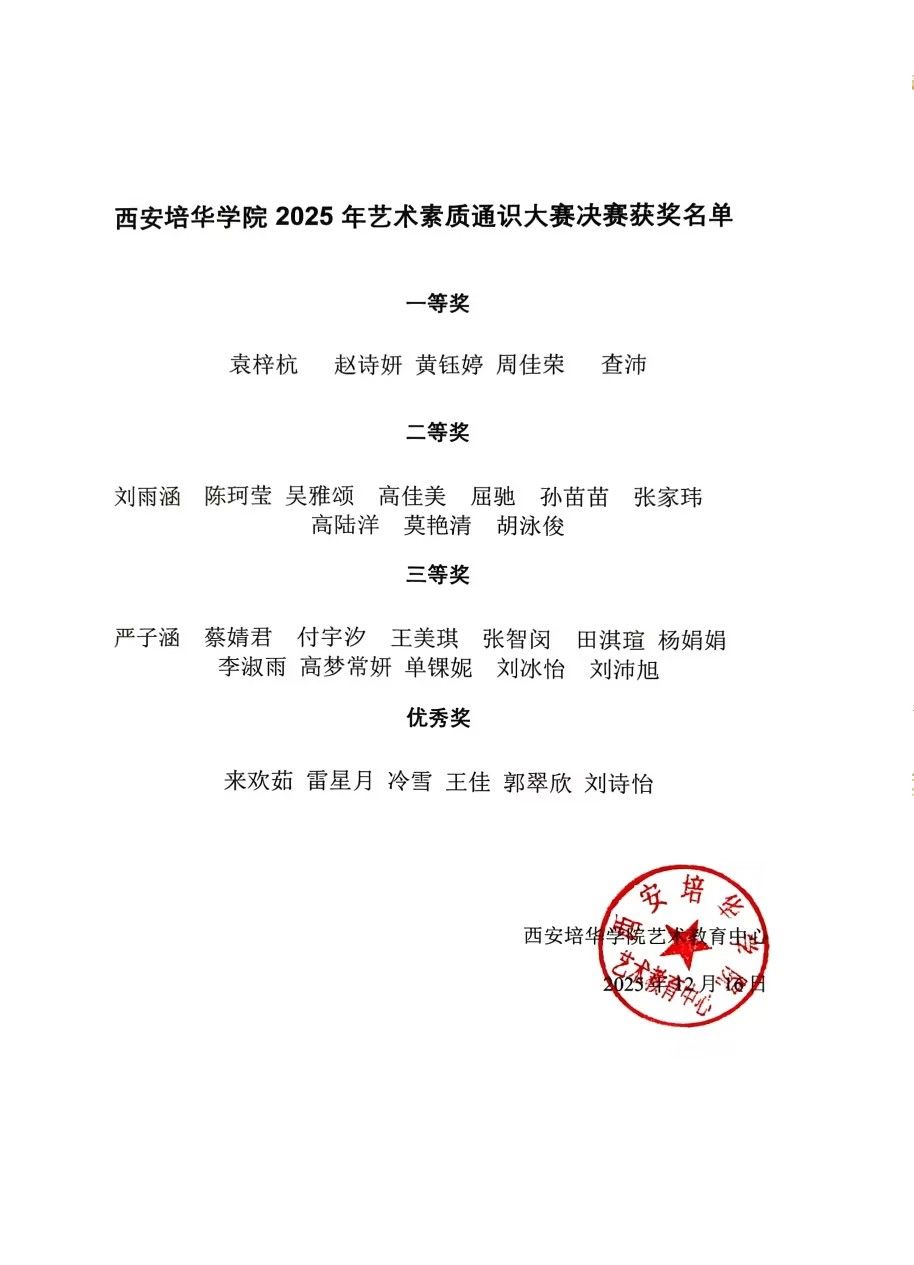 西安培华学院首届艺术素质通识大赛的圆满落幕,是学校美育工作的一次重要突破,也是 “五育并举”“三全育人” 育人理念的成功实践。赛事的成功举办,不仅为学生搭建了展示自我、提升素养的优质平台,更积累了丰富的艺术教育实践经验,为学校后续美育工作的深化开展奠定了坚实基础。