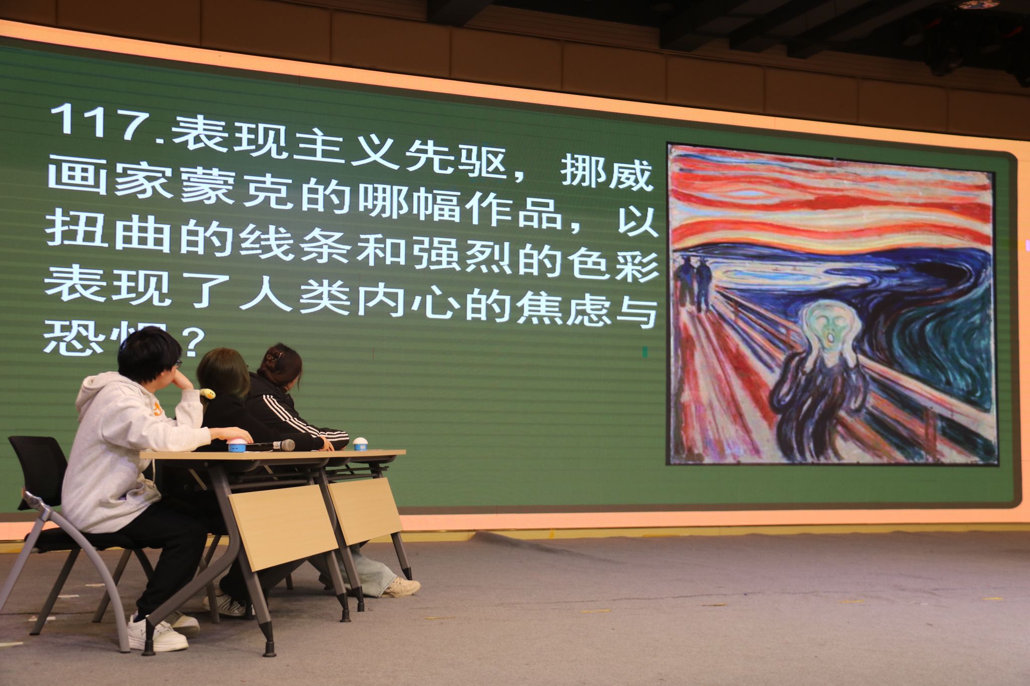 在赛程设计上,赛事分为报名、初赛、决赛三个阶段,形成了 “广泛参与 — 择优晋级 — 巅峰对决” 的科学选拔机制。报名阶段通过各院系广泛动员,最终吸引全校 551 名学子踊跃报名,参赛学生覆盖各个年级、各个专业,真正实现了美育的全员覆盖;初赛阶段采用线下笔试形式,以客观题考察学生艺术通识基础,最终按成绩前 20%选拔出 106 名选手晋级决赛;决赛阶段在恒友楼 4 楼报告厅举行,设置个人循环答题赛、个人抢答赛两个环节,从知识储备、反应速度、能力展现、理解表达等多个维度全方位考察选手的综合艺术素养。现场选手们反应迅速、争先抢答的同时沉着应答,既展现了扎实的知识储备与灵活的应变能力,也让在场观赛师生在沉浸式氛围中同步学习了大量艺术通识知识,实现了 “以赛促学、观赛受益” 的双重效果。