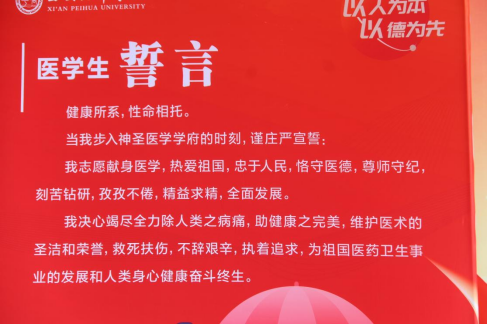 迎新当日,医学誓言屹立在至善楼前,格外引人注目。一声声庄严的宣誓,彰显着医学生对生命的承诺、执着的坚持、锲而不舍的奋斗以及救死扶伤的精神。这誓言如同一座灯塔,照亮医学生前行的道路,时刻提醒着他们肩负的重任和使命,在宣誓的那一刻,新生们眼神坚定,声音洪亮,展现出了对医学事业的崇高敬意和坚定信念。
