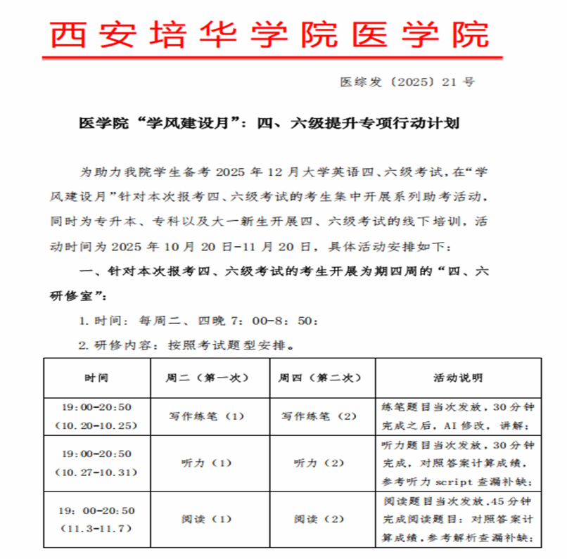 同时,学院落地落细 “教师+辅导员+朋辈” 三位一体帮扶机制,为学生备考提供全方位支撑。辅导员牵头统筹,制定班级个性化备考计划,每日组织晨读打卡督促学生积累医学英语词汇、朗读真题范文,每日进行督学并建立学业预警机制,对备考滞后学生重点帮扶、逐个突破;学业导师与专业教师结合医学专业特点,将医学英语知识融入四六级备考指导,精准破解学生“医学词汇难记、专业语境难懂”的备考痛点;朋辈力量主动发力,由通过四六级的学长学姐牵头组建帮扶小组,开展一对一辅导、经验分享会等活动,传承学院“传帮带” 优良传统,让优秀带动优秀。