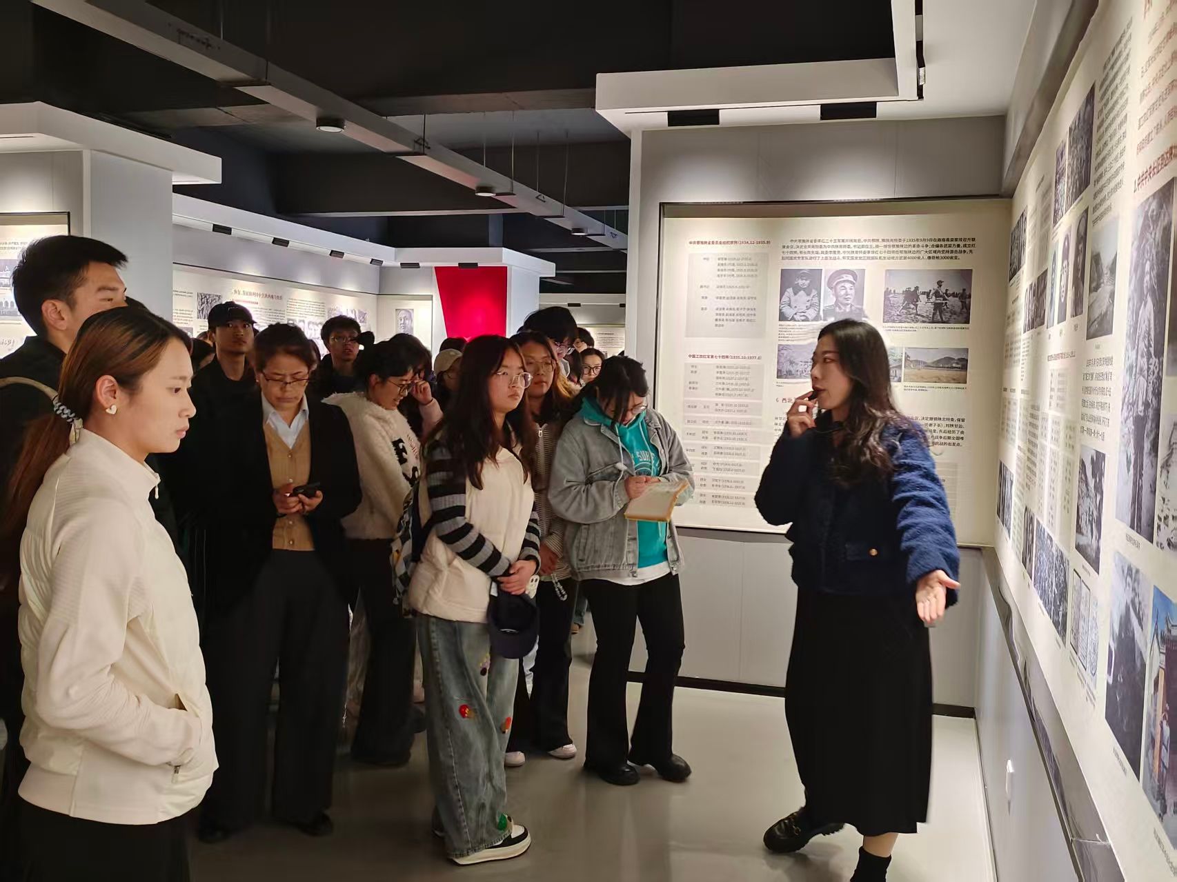 全体同学在李老师的讲解引导下参观了“信仰之光”红色文化展厅。李老师凭借其深厚的理论功底和生动的叙事能力,将展陈内容有机串联,从历史逻辑、理论逻辑和实践逻辑相结合的角度,深刻解读了不同历史时期中国共产党人如何坚守信仰、践行担当。她不仅讲解史实,更着重剖析历史事件背后的精神价值,引导大家思考“何为信仰”、“为何报国”、“何以担当”。从救亡图存的革命岁月到自力更生的建设年代,再到砥砺奋进的改革征程,一幅幅图片、一件件实物生动展现了共产党人矢志不渝的奋斗精神。发展对象们深刻体会到,“报国”与“担当”是贯穿百年党史的红色主线,是先辈们用生命与热血铸就的精神丰碑,为新时代青年锚定了人生航向。