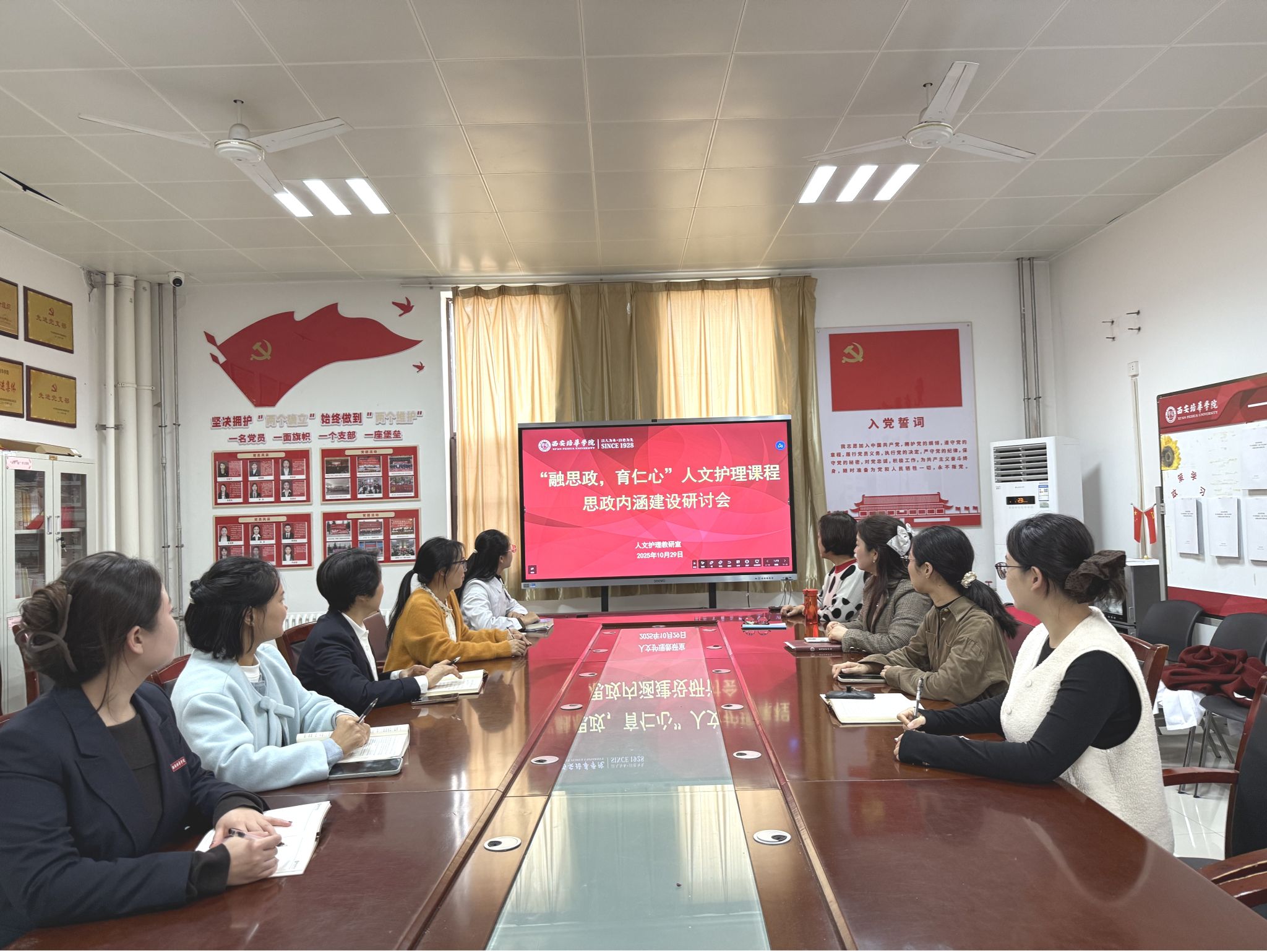 为深化课程思政内涵,扎实推进人文护理课程思政高质量建设,医学院护理系人文护理教研室于10月29日在8330会议室成功举办“融思政,育仁心”人文护理课程思政内涵建设研讨会。会议由人文护理教研室主任张瑜副教授主持,吕蒙蒙老师担任主讲,护理学专业学科带头人刘芳娥教授、心理健康研究院院长刘彦君教授、护理系副主任段思柳及教研室全体专任教师参加了此次会议。