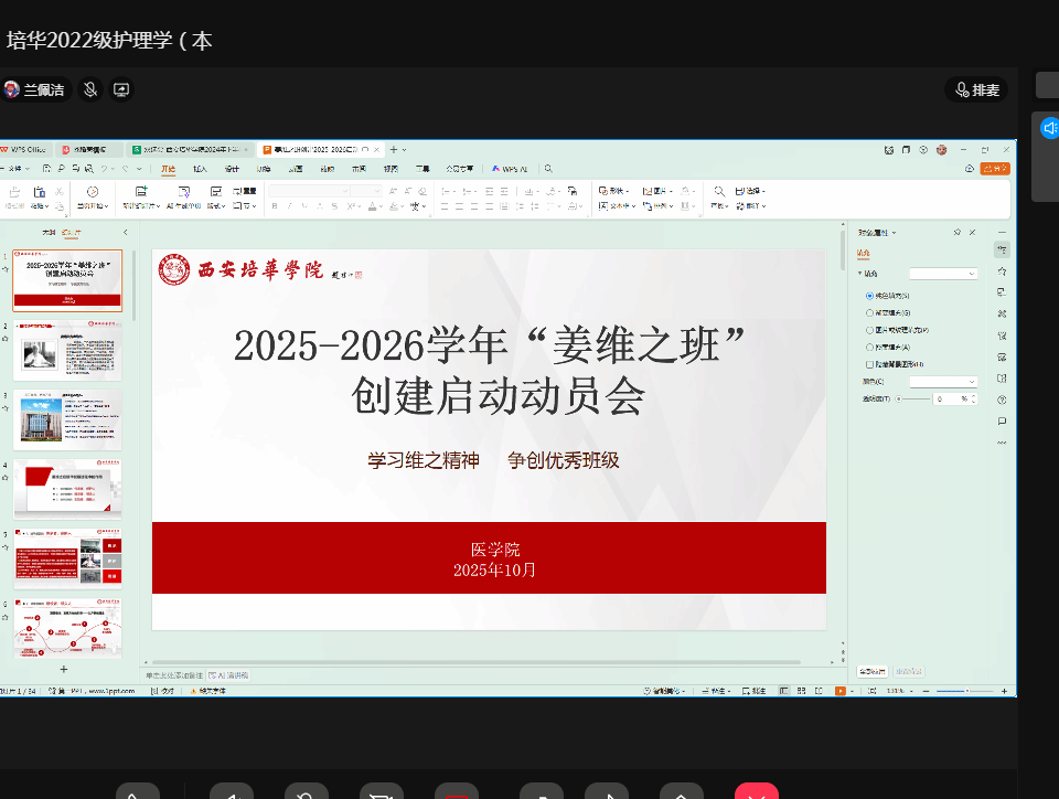 凝聚医学青年力量铸魂育人 为深入落实立德树人根本任务,深化“三全育人”综合改革,进一步提升大学生思想政治教育的亲和力与针对性,助力学生锤炼“八大能力”,持续推进校风、教风、学风、班风建设,10月13日,医学院组织全院所有班级以班会形式召开2025-2026学年“姜维之班”创建启动动员会,正式拉开新学年“姜维之班”创建工作序幕。