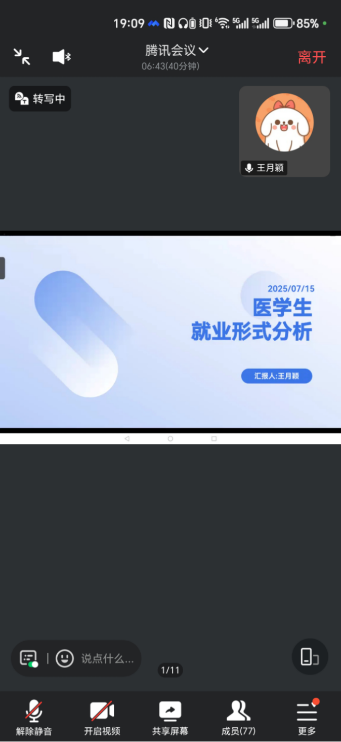 为助力医学院毕业生精准把握就业形势、科学规划职业路径,7月15日19:00,医学院特邀2016届校友王月颖通过线上会议开展就业指导讲座。本次讲座由医学院学生干事唐璠老师主持,2025届、2026届学生代表踊跃参会。