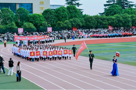 当激昂的进行曲响彻操场,国旗护卫队步伐铿锵,护卫着五星红旗率先入场,为运动会点燃热血序章。春风裹挟着草木清香掠过跑道,医学院方阵昂首阔步而来。教工组身着笔挺正装,步伐稳健从容,眉眼间尽是师者风范;学生方阵青春飞扬,白大褂与彩带交相辉映,口号铿锵有力,尽显蓬勃朝气。两代医者薪火相传,共展医学人的风采。
