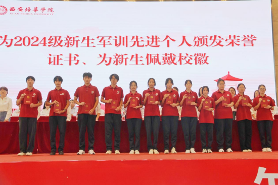 为2024级新生军训先进个人颁发荣誉证书为新生佩戴校徽
