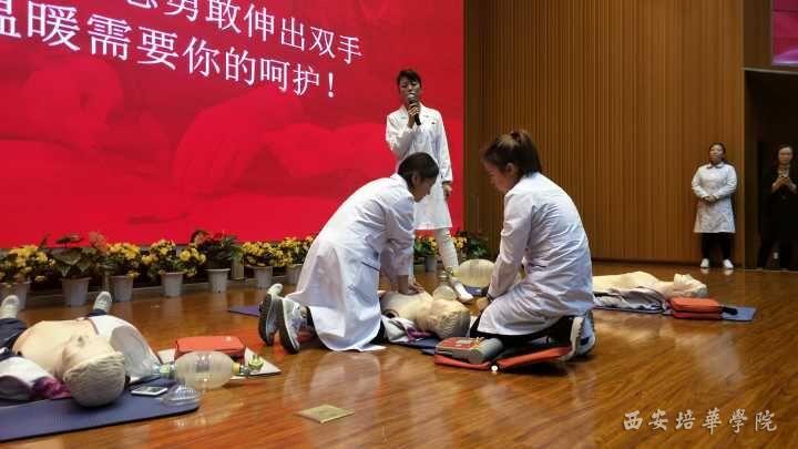 三、由我校校医院和我院王菊宁老师指导AHA学员为现场同学演示了心肺复苏技术的重要性以及AHA急救现场。