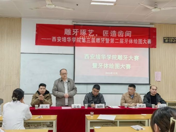 大赛精准对标行业技能要求,设立三大竞赛单元:三倍体右上颌中切牙雕刻赛道、三倍体右上颌第一磨牙雕刻赛道以及牙体创意绘图赛道。为确保评审的专业性与权威性,大赛特邀第四军医大学口腔医院修复工艺科许家庆、数字化中心钟声、陕西丹特威齿科技术发展有限公司美袁三杰,以及本院口腔医学技术专业带头人艾勇副教授共同组成专家评委团,对参赛作品进行多维度、高标准评审。