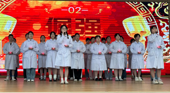 大会第二项,护理学2101班学生歌曲表演医护版《倔强》。歌词中特别强调了逆行者在疫情中不被困难击退、不服输的崇高精神,传达了医护人员在面对困难和挑战时坚强不屈和百折不挠的精神。学生们心中怀揣着的,是对护理工作的无限热爱和对同行护理前辈在面对疫情时不屈不挠、勇于担当、无私奉献表现的崇高敬意与赞赏!