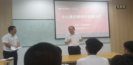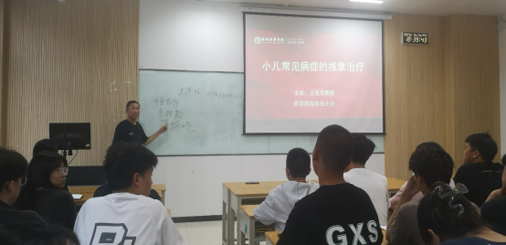 为提升医学人才培养质量,我院始终坚持“请名师拓视野助成长”。临床医学系特邀请我校客座教授王连悦,于9月14日在至善楼8406举办主题为“小儿常见病症的推拿治疗”名师讲堂活动,由临床医学系主任李晓明主持,副校长兼医学院院长于国亮、临床系教师及临床2201班的全体学生参加此次讲座。