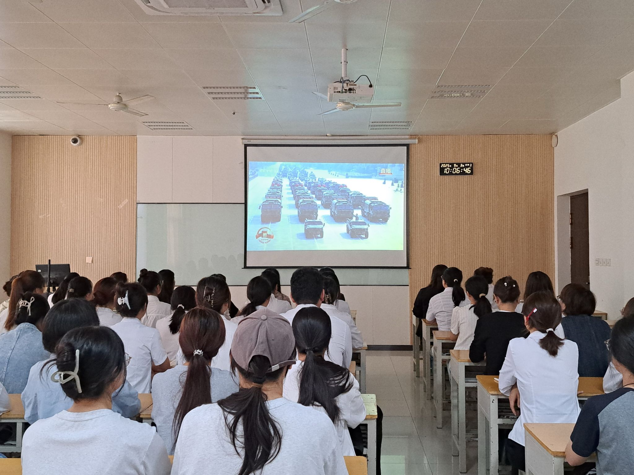 9 月 3 日上午,纪念中国人民抗日战争暨世界反法西斯战争胜利 80 周年大会在北京天安门广场隆重举行,中共中央总书记、国家主席、中央军委主席习近平发表重要讲话并检阅部队。医学院学生第二党支部联合教工第二党支部组织全体党员、积极分子在 8509 教室集中观看阅兵仪式直播,共同回顾历史,缅怀先烈,弘扬伟大抗战精神。