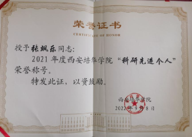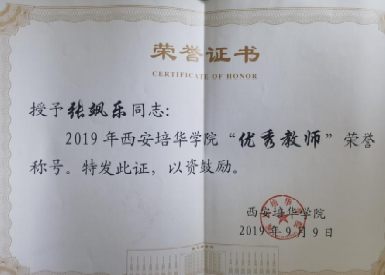 张飒乐同志,曾荣获省级“三下乡”社会实践活动“先进个人”,多次荣获校级“师德先进”、“优秀教师”、“科研先进工作者”、“优秀共产党员”、学生毕业“优秀指导老师”、青年教师双导师制工作“优秀指导老师”、“年终先进工作者”等称号;荣获青年教师讲课大赛二等奖等荣誉称号。